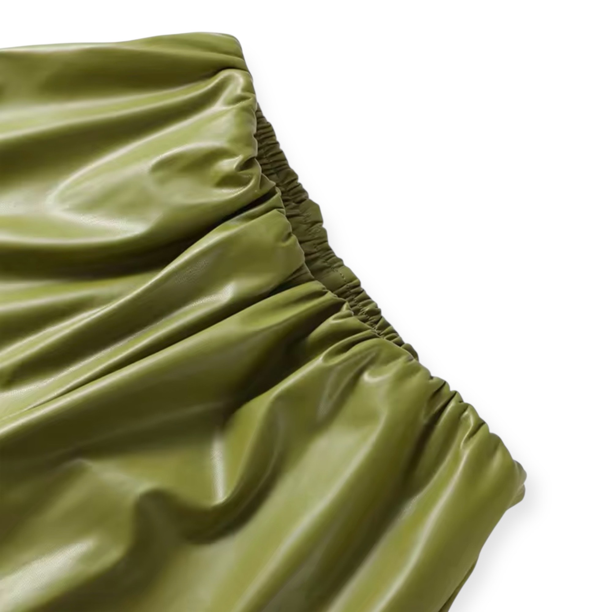 Featuring a high-rise elasticated waistband and relaxed wide-leg fit, they strike the perfect balance between chic and casual. Pair them with the matching Olive Faux Leather Zip Jacket for a coordinated statement, or style them solo with a crisp shirt or oversized knit for a modern, polished finish.